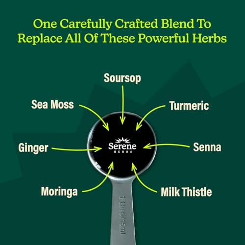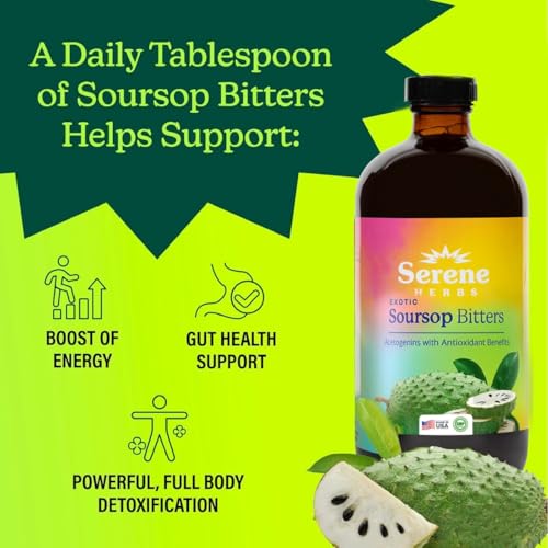 Soursop Bitters Liquid with Soursop Leaves for Gut Health & Immune Boost by Serene Herbs: Experience the potent combination of over 15 natural herbs. This formula has a base of soursop that is enriched by other natural herbs such as black seed, sea moss, ginger, turmeric, Ashwaganda , Irish Moss, Senna, & more. This blend is forumalted for overall convenience.