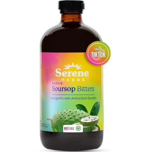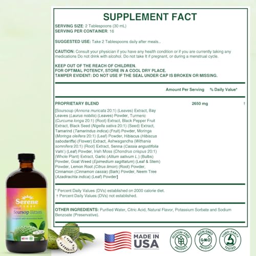 Soursop Bitters Liquid with Soursop Leaves for Gut Health & Immune Boost by Serene Herbs, Organic Herbal Blend with Black Seed, Moringa, Ashwaganda, Senna, Goat Weed & Ginger 16 fl oz |